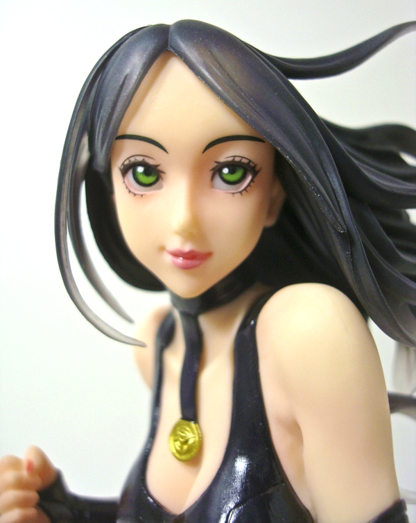 The sculpting of the figure looks fantastic and really captures the style of Shunya’s art. Her female form is a highlight of the piece, accentuating the curves of her figure and her hardened muscle tone. The sleekness of her costume works to further accentuate her form with smaller details such as her chain link belt with blue “jewel” and medallion necklace finishing the look. Her boots are a stark contrast to the rest of the figures offering a more rugged, Goth look with the addition of a tiny skull on the front of the toe. Her face is slightly off from Shunya’s original illustration, different but just as cute with more of a porcelain doll quality to it. I particularly like the subtle little sideways smile that they picked up on from the artwork.