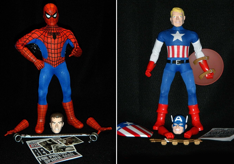 PAINT: The paint applications on both the costume set pieces and the Captain Action figure itself are very clean and uniform. The most striking paintwork is evident on the Spider-Man costume's mask, forearms and boots. The Captain America masks are painted well too, while the boots and forearms seam to just be molded out of solid red-colored rubber.