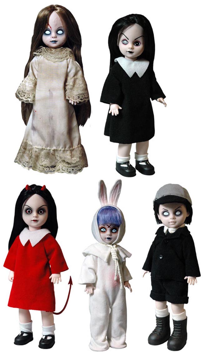 Get this special 13th anniversary series set of 5 for only $79.95! The set includes Sadie, the very first Living Dead Doll character ever made, the devilish delight named Sin, the bad little bunny Eggzorcist, the demonic schoolchild Damien and the possessed little perfection Posey.