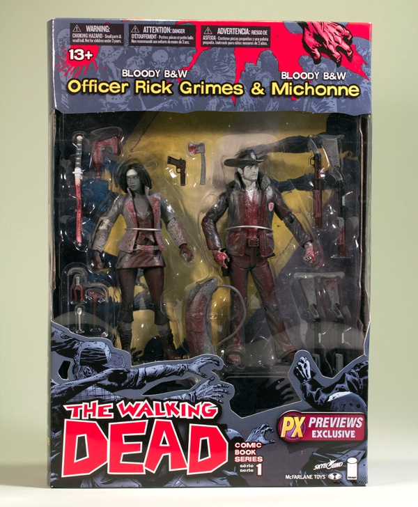 As reported in our story HERE, Diamond's PREVIEWS is offering Walking Dead fans an exclusive black and white, blood-splattered figure 2-pack (order code: JAN120621). The set, shipping in May, features variants of Officer Rick Grimes (with bag of weapons) and Michonne (comes with sword and tools of revenge). Check out the new photos in our gallery below.