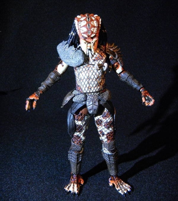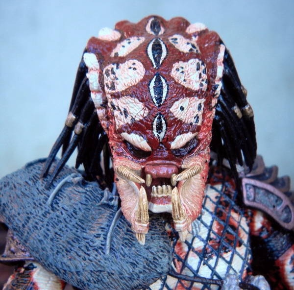 The colored patterns and shapes on the Snake Predator look as if they could belong to a member of the reptile species in real life. The paint applications on the exposed Snake Predator's head are vibrant and clean. The shoulder and waist fur pieces are colored in various shades of grey which contrast nicely against the worn copper-colored armor.