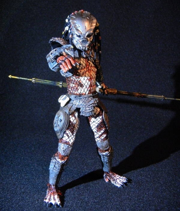 The Stalker Predator has very light upper-body armor and a helmet which is reminiscent of the Boar Predator from the previous wave. The Stalker features sculpted leather armlets similar to the Shaman Predator. The left forearm features a unique ornate bone formation attached to the leather wraps.