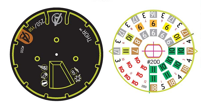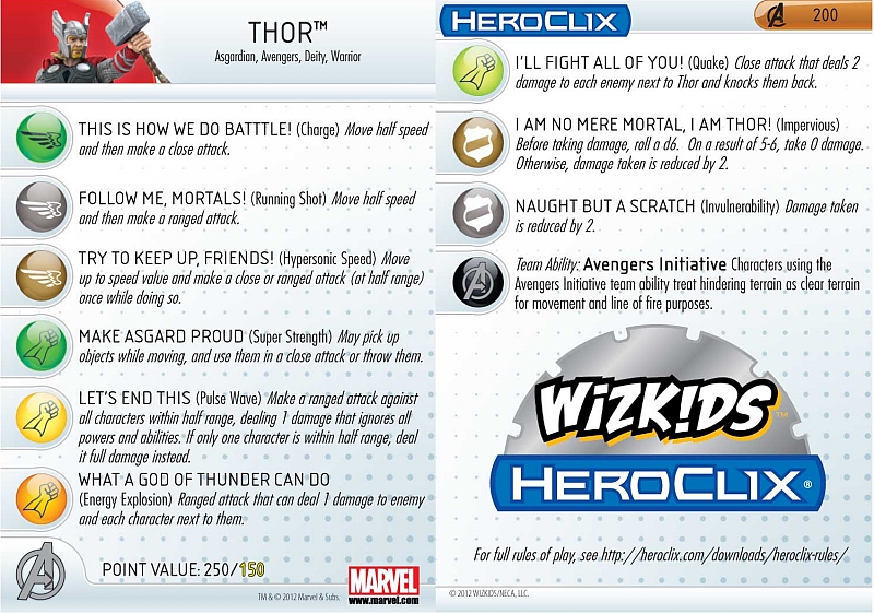 Playable at two different point values, 250 and 150 points, Thor is a veritable powerhouse to the battlefield. A full dial of move and attack powers coupled with a good balance of both close-combat and ranged-combat powers makes Thor a daunting piece to oppose on the HeroClix map. Thor also wields his trusted weapon, Mjolnir, as represented by his 8 Range and his Flight and Indomitable abilities ensure that Thor will be able to take full advantage of the battlefield as he maneuvers into position and presses the attack against his enemies.