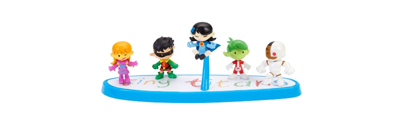 They may be miniscule, but they’re mighty! The core team of Tiny Titans is rendered in 1-1/2” scale in this 5-pack of collectible figures including Robin, Raven, Starfire, Cyborg, and Beast Boy. Sidekick City Elementary is just a quick bus ride away with packaging featuring specially commissioned artwork from Tiny Titans’ series creator. The display base has both the official Tiny Titans logo and a “flight” stand just for Raven.