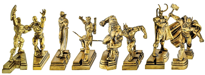 Each gold plated resin sculpture features a Marvel hero and a letter. When all the pieces are assembled together they spell out "A-V-E-N-G-E-R-S". Set contains eight (8) characters: Captain America (A), Iron Man (V), Vision (E), Hawkeye (N), Hulk (G), Giant Man (E), Loki (R), and Thor (S). Collect one or all to show your spirit and love for Marvel Avengers.