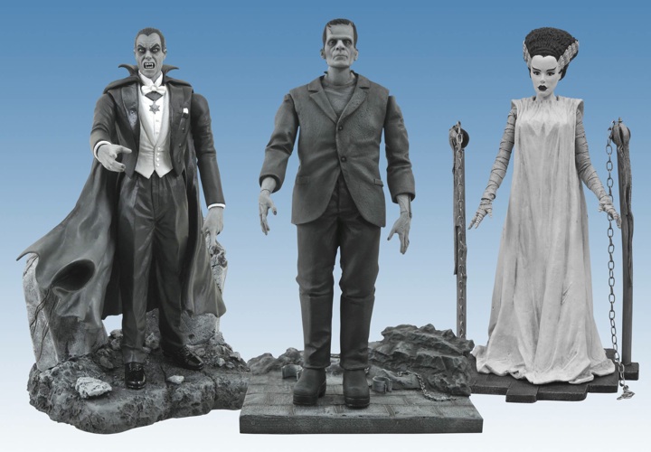 Last year, DST honored the cinematic origins of the Mummy, the Wolfman and the Creature from the Black Lagoon by releasing them as a boxed set of black-and-white figures (read our review HERE) - the way they were originally seen in theaters - dubbed the Legacy Series. Well, this year, DST is adding to the legacy with a boxed set of Dracula, Frankenstein and the Bride of Frankenstein, all in stunning black-and-white (picture above). With sculpting by Gabriel Marquez, Rudy Garcia and Jean St. Jean, these 7-inch figures will come packaged in a beautiful display box, but each will also come with a base for out-of-package display.
