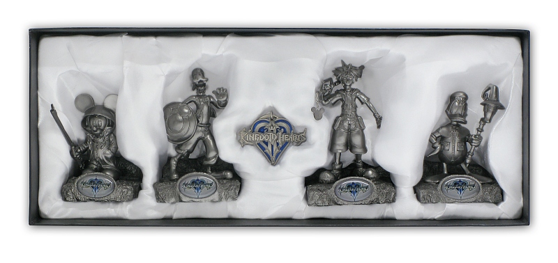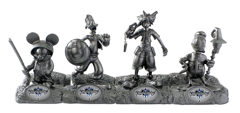 Based on characters from the hit video game, this four figure set includes detailed resin sculptures of Mickey, Sora, Goofy, and Donald. The characters stand on Kingdom Heart logos and when placed next to each other, create a complete image. As an added bonus, the set includes a free Kingdom Hearts Logo pewter key ring.