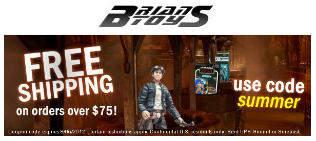 Enjoy FREE SHIPPING on orders over $75 at brianstoys.com! This offer is good for in-stock orders shipped within the lower-48 states by August 5th, 2012. Use it on your next purchase of the latest 2012 Star Wars toys or any original Star Wars action figures AFA. The choice is yours! Most items curerntly in our inventory qualify for this offer (pre-orders do not qualify). Large items that incur "oversize" surcharges may not qualify.
