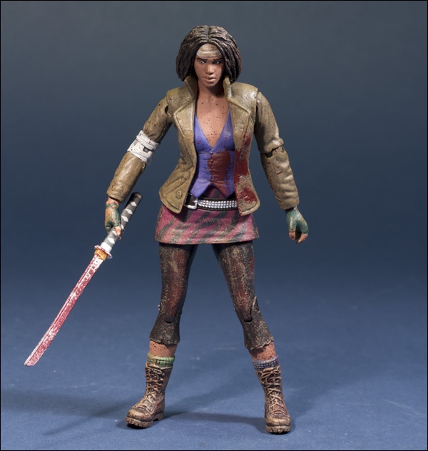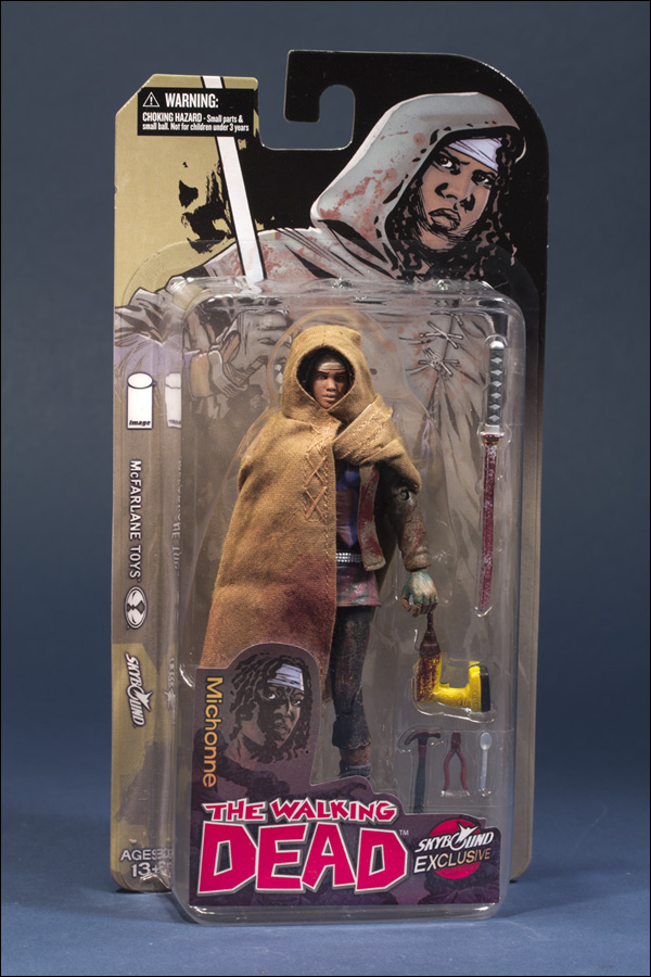 McFarlane reveals that they will be offering an exclusive Walking Dead action figure at this year's San Diego Comic-Con. Available exclusively from Skybound Entertainment priced at $25, McFarlane Toys’ limited edition Bloody Michonne action figure features the blood-spattered poncho she wore upon her first encounter with Rick and the survivors. The figure comes with bloody versions of her signature katana sword and various implements of revenge including a power drill, hammer, pliers, and spoon. Features approximately 22 points of articulation. Packaging features new art The Walking Dead artist Charlie Adlard.