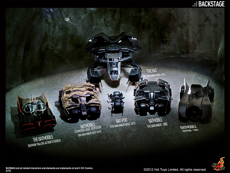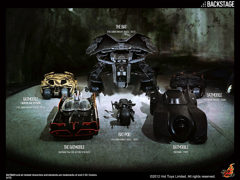 Hot Toys has brought many collectible figures from the Batman movies to fans. Besides collectible figures, Hot Toys also brings the giant movie vehicles into reality – The Bat, Camouflage Batmobile and Bat-pod from the highly anticipated The Dark Knight Rises movie (2012), Batmobile in different designs from The Dark Knight (2008), Batman (1989), and Batman 1966 Live-action TV Series.