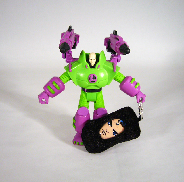 Mimobots are cute... but Mimomicros are downright adorable, even Batman! The tiny Bruce Wayne is chubby and squat with a large, blocky head (complete with ear tips). All of the necessary details are there like Batman’s iconic gray and black costume, the bat-symbol, utility belt, and cape. There’s even a tiny batarang stuck in his belt! Wayne’s expression is suitably dour with a scowl and furrowed brow under his cowl.
