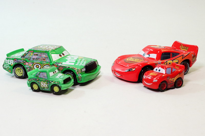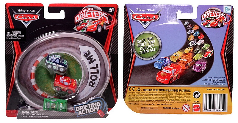 Each 3-pack of the Micro Drifters contain a different set of cars that are visible to the buyer, making collecting the characters you want that much easier. The set we’re looking at comes with Lightning McQueen, Chick Hicks, and Clutch Aid no. 121. The “Roll Me” feature allows you to spin the package around, sending one car in a loop, just so you can get an idea of what you’re buying before you commit. It’s a clever and interactive feature.