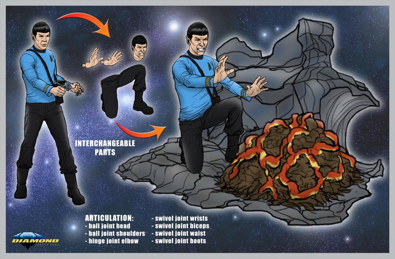 The first release depicts Mr. Spock as he appears in the classic episode "Devil in the Dark". This figure includes a cave diorama with a Horta alien - the first Horta toy ever made! Spock himself will have interchangeable legs for standing or crouching poses, and interchangeable hands to hold a phaser or establish a mental link with the Horta. He even comes with an alternate screaming head. The figure will be available in early 2013, and will be followed by James T. Kirk, as well as numerous other important and fan-requested characters from the Star Trek diaspora.