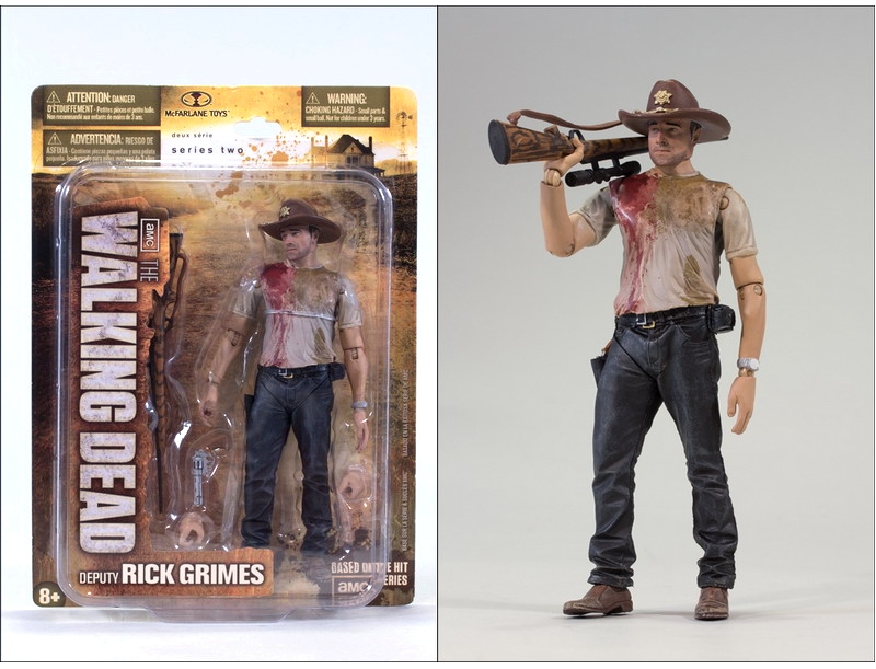 Rick is depicted in a brand-new sculpt in his civilian attire, prevalent in season two. Figure features interchangeable hands to hold multiple weapons, along with 14 points of articulation. Additional accessories include removable revolver, rifle with strap, and animal control stick for zombie catching.