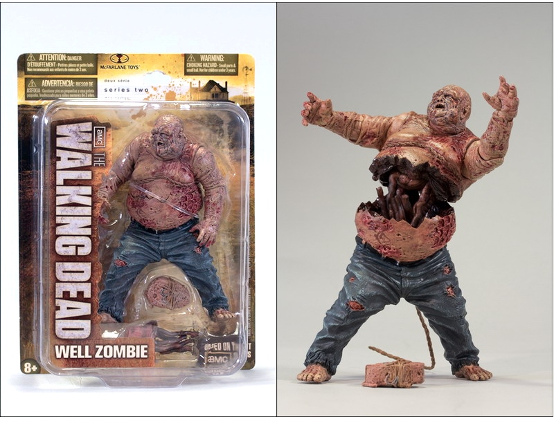 A rotten, bloated zombie surprise resting at the bottom of Hershel’s water well that the survivors eventually attempt to hoist out by using Glen as bait. Figure includes 9 points of articulation with a pull-apart play-action that reveals his soft gooey guts inside. Accessories include attached rope and canned ham.