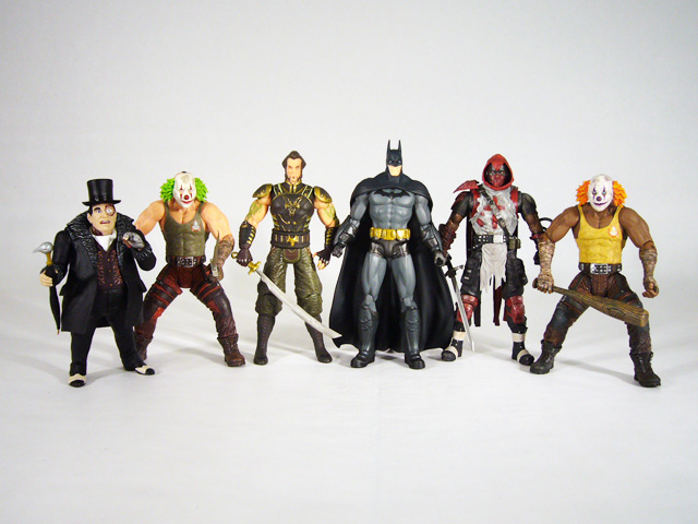 Batman: Arkham City exploded onto the video game scene last year, and quickly became one of the best selling and best reviewed games of the year. With its immersive storytelling, beautiful graphics, excellent character selection, and smooth action, the Arkham City even blew away its predecessor, Arkham Asylum. City takes you (as Batman) into a section of Gotham City transformed into a prison full of super-villains, everyday criminals, and even innocents and political prisoners. Only Bruce Wayne can keep watch over this new Arkham and deal with the chaos barely contained within its walls. Of course, through the course of the game you come into contact with plenty of great characters from the Batman universe, each with appearance and mannerism specific to the game. Thankfully, DC Collectibles is there to bring these characters to life in plastic, with the third series of Arkham City action figures on shelves now! Read on as we take a look at Batman, Ra’s al Ghul, Azrael, Penguin, and two different versions of the Clown Thug.