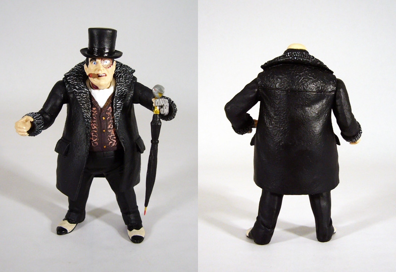 Each of the six figures in this series has its own accessory or accessories, which is pretty cool. Batman has just one small accessory, the explosive gel dispenser. It may not be a flashy sword, but it has a very detailed sculpt and looks great in silver and metallic paint. Each Clown Thug has his own signature weapon: the orange-haired Thug wields a “Gothamville Sluggo” bat with wood-grain design while the green-haired Thug brandishes a massive knife. Ra’s al Ghul and Azrael both have swords, the former a massive Oriental-inspired weapon with etched details on the blade and the latter the infamous Sword of Sin complete with scabbard that fits on Azrael’s belt. The Penguin shines yet again with a black top hat, umbrella (with penguin head and bloody tip), and a lit cigar that fits not only in his clenched fingers but also in his mouth!