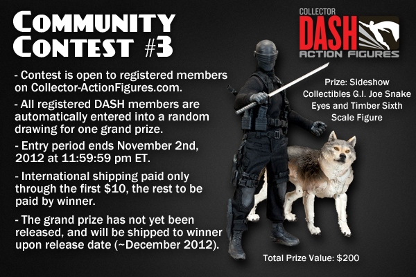 In the latest contest from Collector-ActionFigures.com, we decided to give G.I. Joe collectors some love by giving away a figure based on one of the most beloved and iconic character in all of action figure history. One lucky winner will be taking home an incredible Sideshow Collectibles Snake Eyes and Timber sixth scale figure courtesy of DASH. This exclusive figure is limited to 1000 copies, is valued at $200, includes a bundle of extras including a fully-articulated Timber figure, and it could be yours.