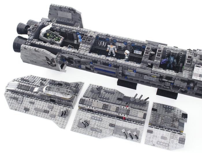 A massive capital scale spaceship is nearly 3 foot long when assembled, and comes in a special flip-top box with tons of artwork. And while the outside is covered in cool details and weapons, you can open it to reveal a control corridor, armory, and the famous Cryo Bay. The Forward Unto Dawn set comes with a UNSC technician, a UNSC officer, a blue-armored Covenant Elite Zealot, and Master Chief in metallic green armor! There's even a Cortana mini-figure on an exclusive light-up base (batteries included). Forward Unto Dawn is due out later this month with an MSRP of $249.99.