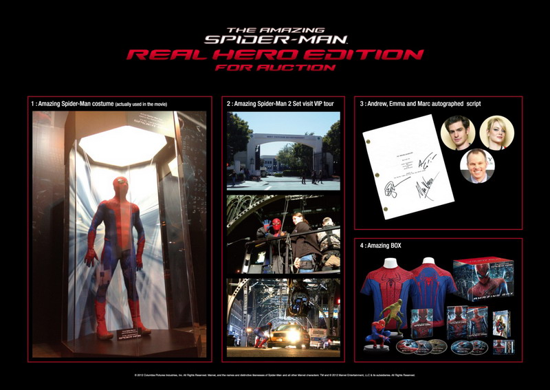 The set is the one of its kind and includes: a Spider-Man suit that was actually used in the filming of the Amazing Spider-Man; a copy of the script autographed by Andrew Garfield, Emma Stone, and director Marc Webb; a visit to the set of The Amazing Spider-Man 2, which is currently scheduled to start filming in early 2013; and one of 3,000 limited-edition The Amazing Spider-Man Amazing box, containing the Japan Only Spider-Man Suit T-Shirt, among other things. Proceeds from the auction will be donated to the Japanese Red Cross Society to help the victims of the Great East Japan Earthquake and Tsunami, and also to Worldwide Orphans, which helps orphans all over the world and is supported by Andrew Garfield.
