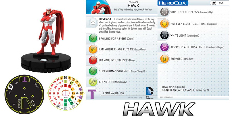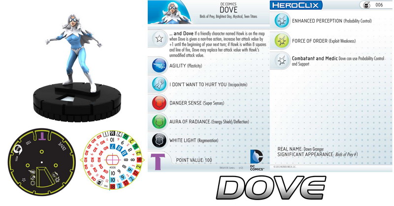 Distinct from their versions in the Streets of Gotham booster set and elsewhere, these figures have unique dials and powers that set them apart but still capture the characters perfectly. The brutish Hawk is a solid “brick”-type figure with a good mix of Charge with Super Strength, Leap/Climb, Close Combat Expert, Flurry, Quake, and Battle Fury; damage reducers run his entire dial until Regeneration on his final click to get him back in the game! Dove, meanwhile, is a tough opponent to take out as she whittles down your team with Flight, Incapacitate, Super Senses, Probability Control, some Exploit Weakness, Plasticity, and Energy Shield/Deflection; late game she too picks up Regeneration and Support as well. Always best as a pair, the two buff each other via the Titans team ability and Traits; Hawk gets a defense boost while Dove’s attack is increased.