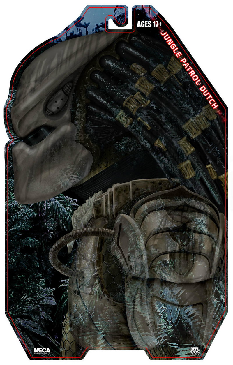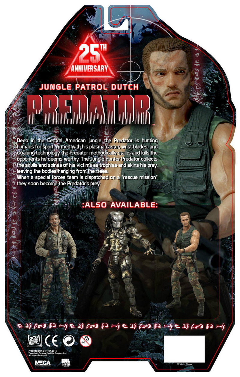 NECA provides a look at the packaing front for their upcoming Predator Series 8, an all-new design celebrating 25 years of the 1987 sci-fi classic. Predator Series 8, arriving in late February 2013, includes Masked Jungle Hunter and two versions of Arnold Schwarzenegger's character Major Alan "Dutch" Schaefer: Jungle Extraction Dutch and Jungle Patrol Dutch (the back of his card is pictured below).