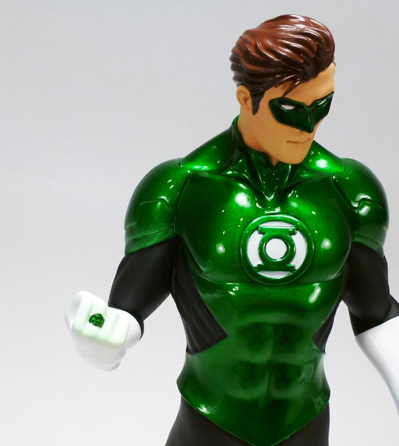 While there’s plenty to enjoy on the sculpts, it’s the paint that really brings them to life. Koto fully embraced a bright metallic look for these statues, a risky decision that really paid off. Superman is resplendent in a bright silvery blue that’s offset nicely by the metallic red and yellow of his “S” emblem and the red on his boots, belt, cuffs, and collar. Meanwhile, Clark’s cape is a matte red with black emblem on the back. Naturally, Superman has jet black hair and dark eyes. Green Lantern also benefits from a metallic look, though his is a little less splashy. The black sections of his uniform are matte, and the white gloves have a bit of a sheen to them; the green, however, is a deep metallic hue that looks almost like liquid, and it’s especially effective on the statue’s mask. Hal’s eyes are white to match the color on his chest emblem, and his hair is a uniform medium brown.