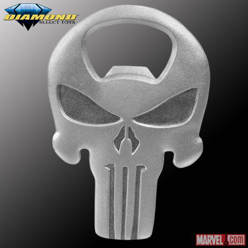 Diamond Select Toys introduces the latest entry in their licensed Marvel bottle opener collection. This solid metal bottle opener, in the shape of the Punisher's iconic skull logo, measures four inches long and can get any bottle cap to open up faster than Jimmy the Snitch. It even has magnets on the back so you can mount it on your refrigerator, gun safe or ammo case. Comes packaged in a collector’s case with a full-color wrap.