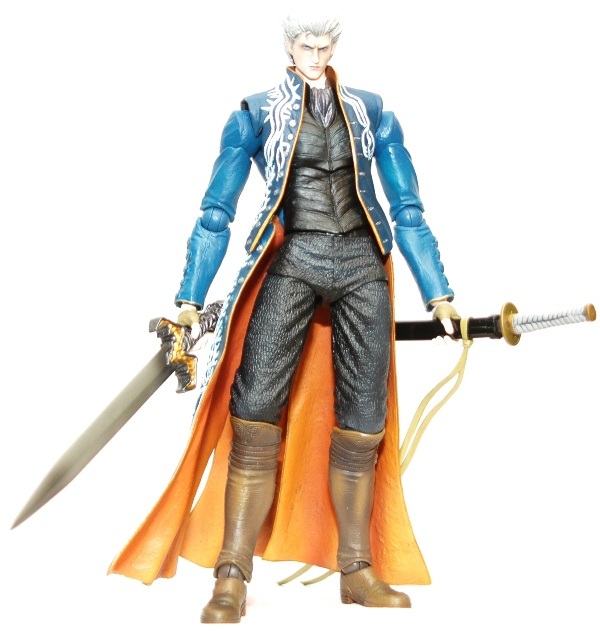 Vergil includes an alternate pair of hands as well as his trademark katana Yamato and his heritage sword Force Edge - the Sword of Sparda. Each character's weapons compliment the figure and, should a collector own both figures, it's possible to have Dante wield the Force Edge, the ultimate objective of the game.