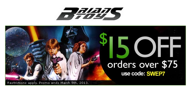In light of the recent announcement that the Star Wars saga will continue with Episode VII, BriansToys.com is offering a $15 OFF coupon to all customers at Brian's Toys who spend over $75 between now and March 5th, 2013.