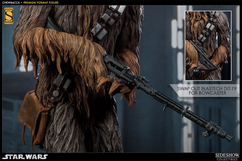 Sideshow has released new photos and details on their latest Star Wars Premium Format Figure: Chewbacca. Standing over 23 inches tall, the regular and Exclusive versions of Sideshow's Chewbacca Premium Format Figure will be outfitted with his signature bowcaster and satchel. The Exclusive Chewbacca Premium Format Figure will include an additional switch out hand, arming Chewie with a Blastech DLT-19 Rifle.