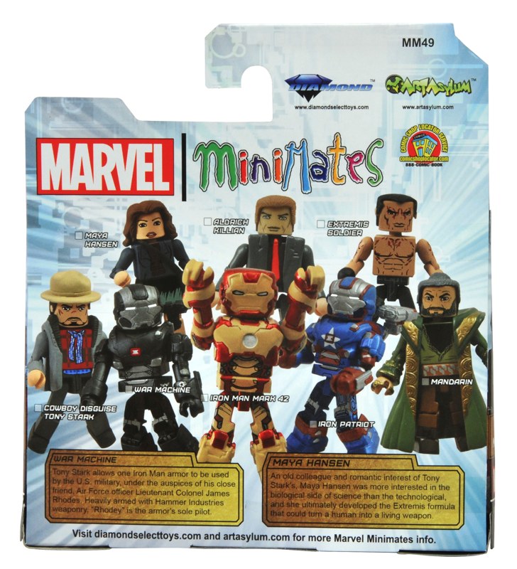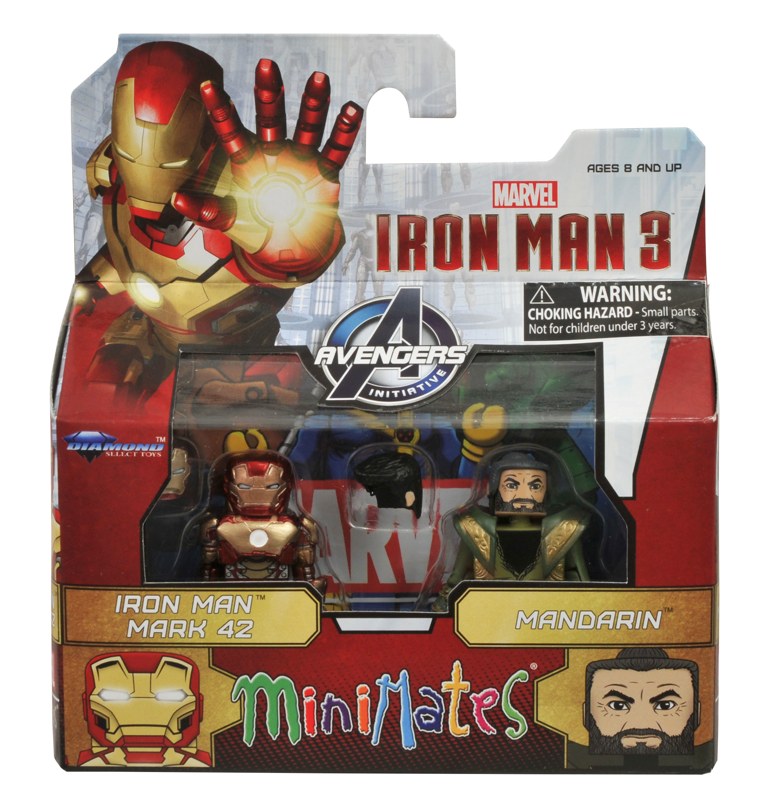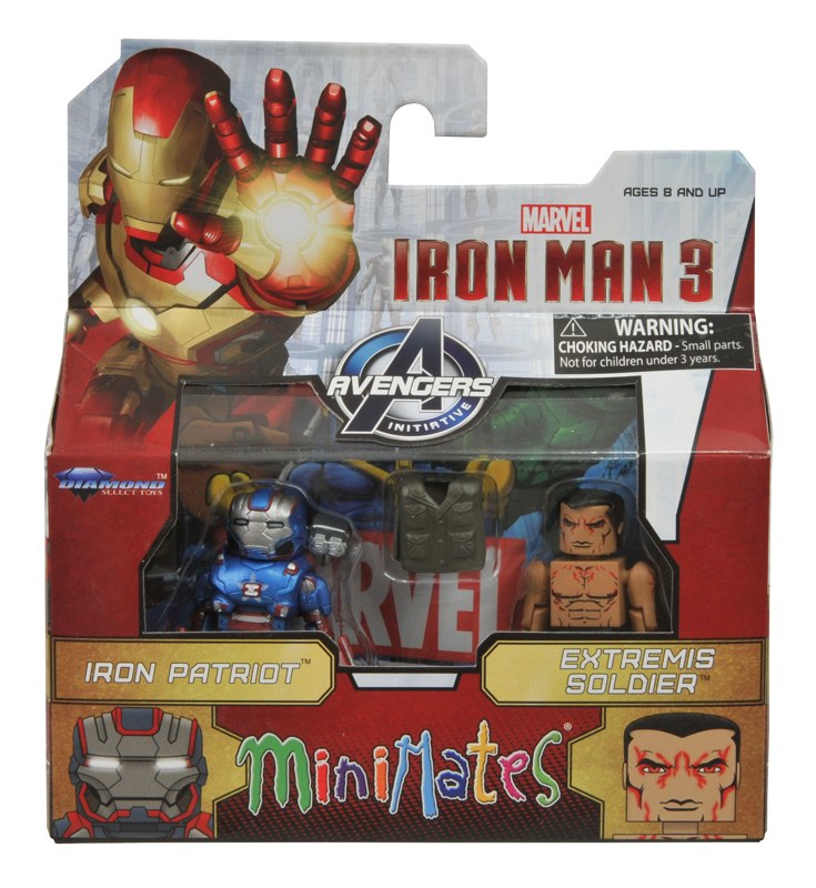 Diamond Select Toys provides collectors a look at the packaging for their Iron Man 3 specialty assortment. DST's 49th consecutive assortment of 2-inch mini-figures will include four 2-packs, two exclusively at comic shops and specialty stores, and two shared with Toys"R"Us. The specialty assortment includes: