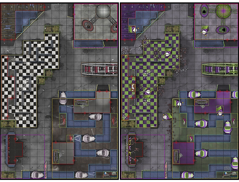Not necessarily associated with fun and good times, even Gotham City’s hot spots are abandoned and decrepit if the Dockside Amusement Park map is any evidence. The location of No Man’s Land Month 6 tournament, the Amusement Park is an outdoor/indoor map featuring a ticket booth, Tunnel of Love ride, Ferris wheel, house of mirrors, and a kid’s ride. All of the above are dirty and in disrepair with lights out and huge cobwebs. Players start in opposite corners, one adjacent to the Love ride and utilizing the elevated ticket booth and the other entirely elevated within the other ride’s space. The outdoor areas have some water terrain peeking through the dockside surfaces, more elevated terrain, blocking (Ferris wheel), and some hindering where the ground is cracked and overgrown. The Tunnel of Love building has a meandering water track, hindering machinery and signs, and elevated control booths. Finally, the house of mirrors is a maze of walls with an elevated viewing platform. The variety of terrain (outdoor and indoor) on this map will make for very interesting games.