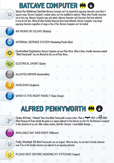 The Batcave Computer and Alfred Pennyworth both come equipped with the Batman Ally and Hypertime Team Abilities, while the Computer has a comprehensive trait giving it the feel of a high tech system created by Batman and embedded in a cave. With no movement it strikes with a potential 8 range and the Sharpshooter ability, and features powers including Plasticity, Penetrating/Psychic Blast, Pulse Wave, Quake, Invulnerability, Toughness, and Shape Change.