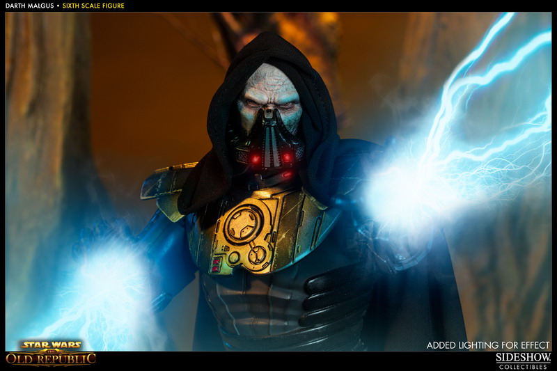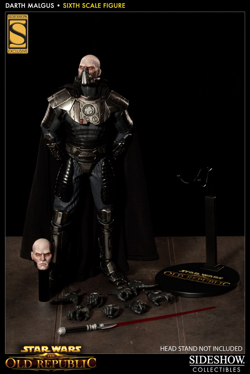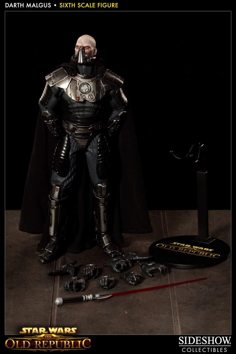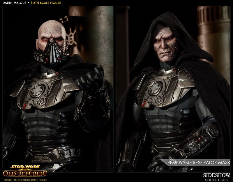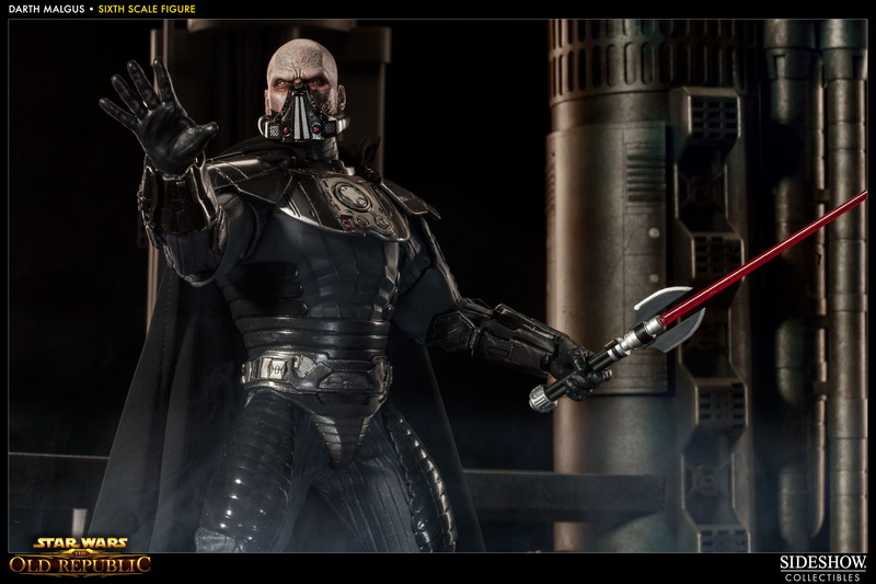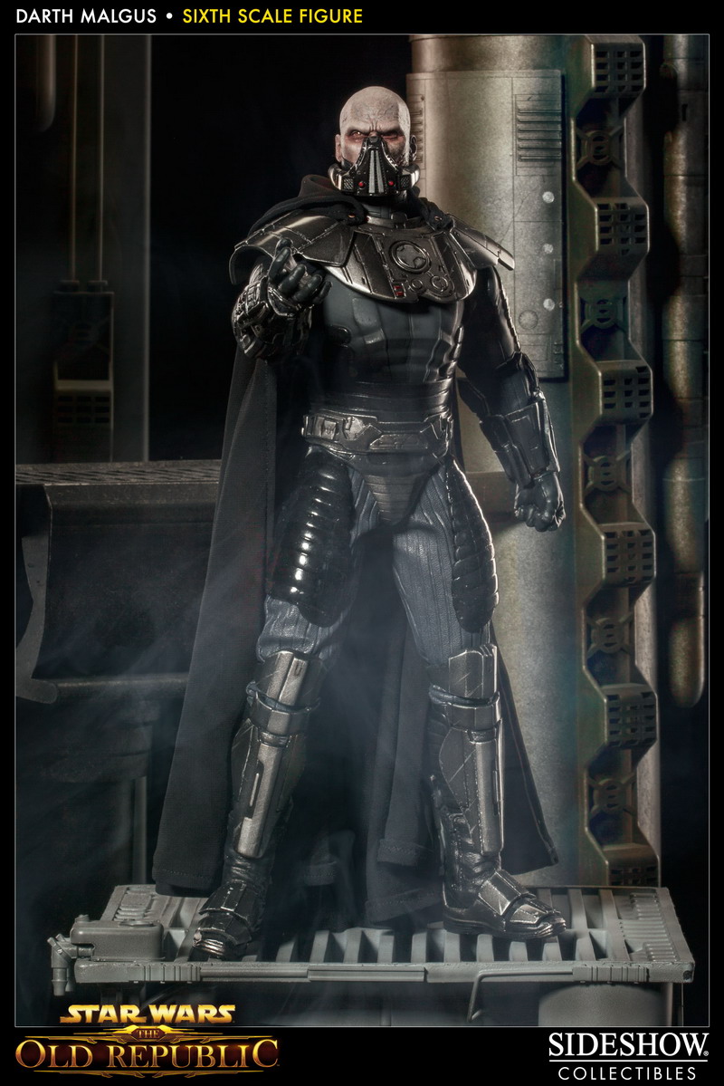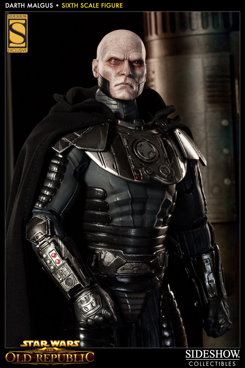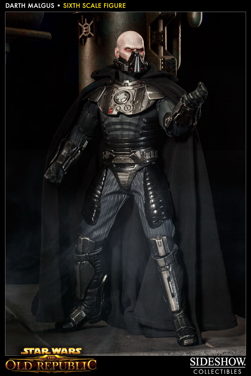 Photos have bene released revealing Sideshow's latest 1:6th scale Star Wars figure: DARTH MALGUS. The Sith Lord, as seen in the video game Star Wars: The Old Republic, will features a fully articulated Prometheus body, outfitted with detailed Sith Raider armor, and a fabric cape with poseable hood.