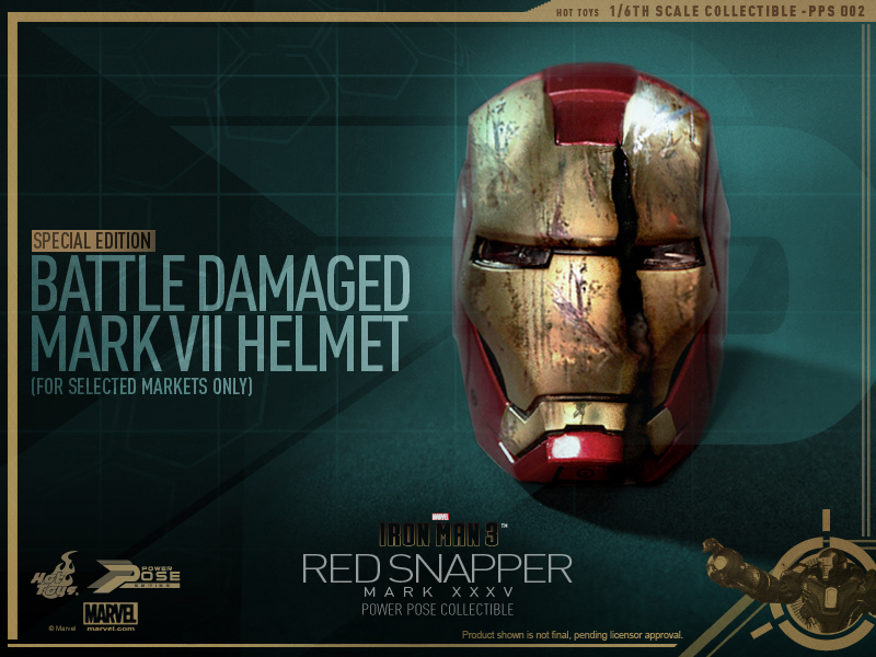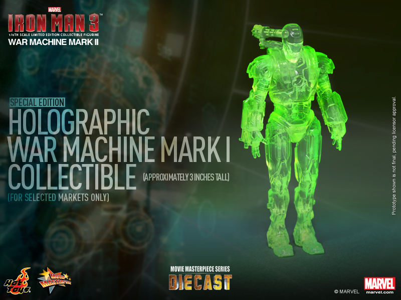 The special edition of Power Pose Red Snapper will include a battle damaged Mark VII helmet (pictured above) as seen in Iron Man 3 while the special edition of War Machine Mark II will include a War Machine Mark I Holographic collectible (below).