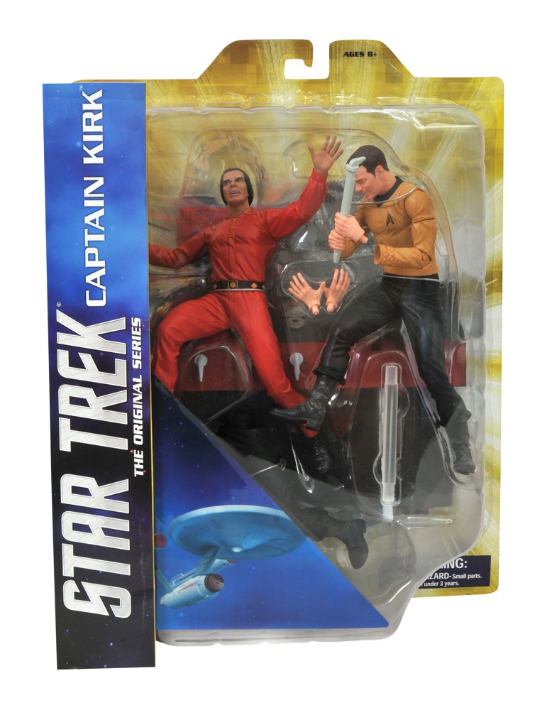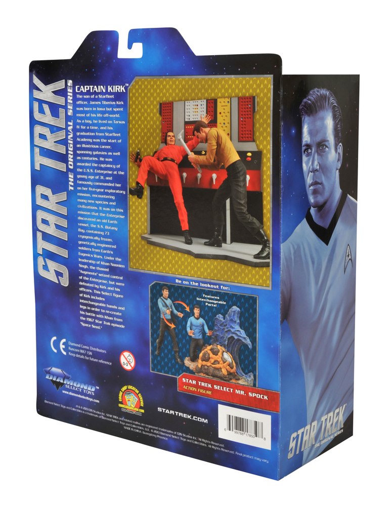 Following the release of Marvel Select Mr. Spock (see HERE), Diamond Select Toys will be offering Captain Kirk. Arriving at comic shops and specialty stores in early June, Kirk comes with an engineering room diorama base, a second set of hands, a broken phaser and a control rod, as well as a second set of legs so he can deliver a flying kick to the reeling figure of Khan himself. Check out the new packaged photos.