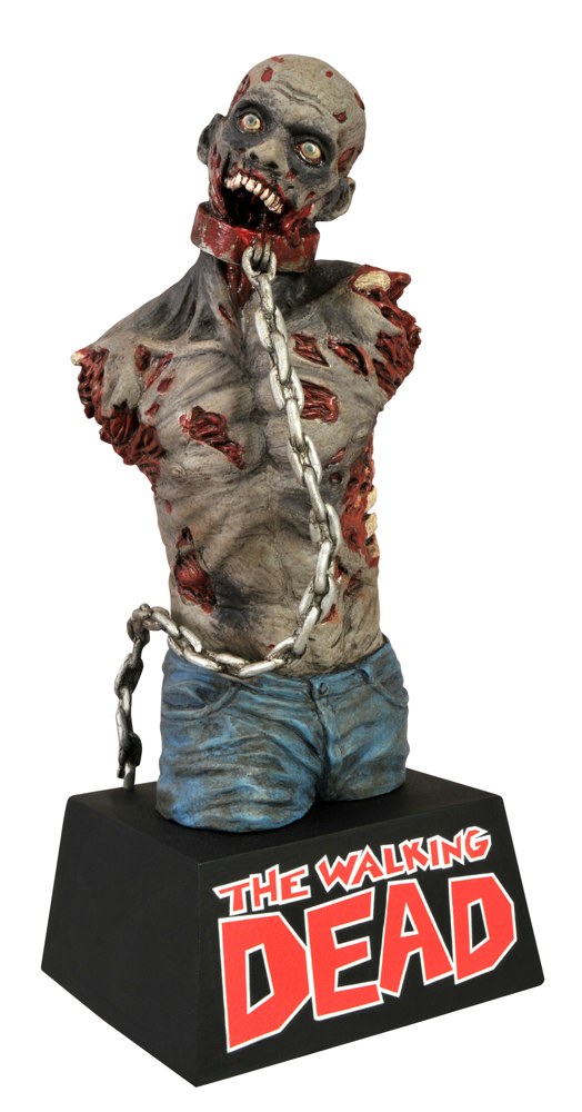 Sculpted by Eli Livingston, Michonne’s pet zombie Mike (or is it Terry?) has a collar and chain, but no arms or jaw, and is posed atop a black base with the Walking Dead logo. Place coins through a slot in the back, and remove them through a door in the base... or just leave him in his cool display tray (available at Toys"R"Us). Pick him up at TRU – or look for him roaming free in comic shops and specialty stores – this summer.