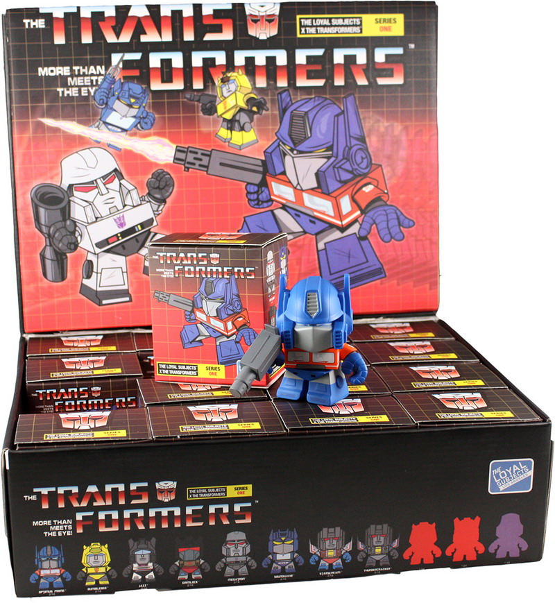 The Loyal Subjects announce that their first assortment of TRANSFORMERS mini vinyl figures have arrived and are available for purchase at theloyalsubjects.com. This assortment of 3" tall figures includes OPTIMUS PRIME, MEGATRON, BUMBLEBEE, STARSCREAM, JAZZ, SOUNDWAVE, THUNDERCRACKER AND GRIMLOCK -As well as 3 Chase figures (1/24, 1/48, 1/96). Each figure features 7 points of articulation and a weapon. These are available as a case of 16 priced at $208 (2 of each revealed character, unless chase figures are in case packs) or individually blindboxed at $12.99 each.