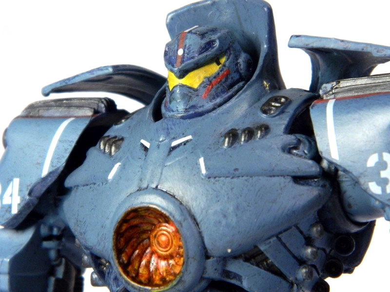The main hero mech of the movie (go U.S.A.!), the Gipsy Danger sports a humanoid profile made famous by classic Super Robots such as Mazinger, Gundam, even the Iron Giant. While not the most exciting look, it is a very familiar (comforting?) appearance - like an avenging metal titan made in mankind's image. Standing 7 1/2 inches tall to the top of its armored neck collar, the Gipsy Danger strides into battle with a patriotic color scheme of red, white and blue. The bluish grey is the predominate color, lending the robot an almost WWII naval warship vibe. Red and white armor trim and insignia continues that American battleship feel, while yellow is used as a color pop on the visor and knees. A rusty orange radiates from the Gipsy Danger's whirling chest cavity - a power source or mega beam weapon? Lastly, a dark gunmetal grey is used on all of the Gipsy Danger's exposed machinery, the use of brushed silver giving the components the appearance of real metal.