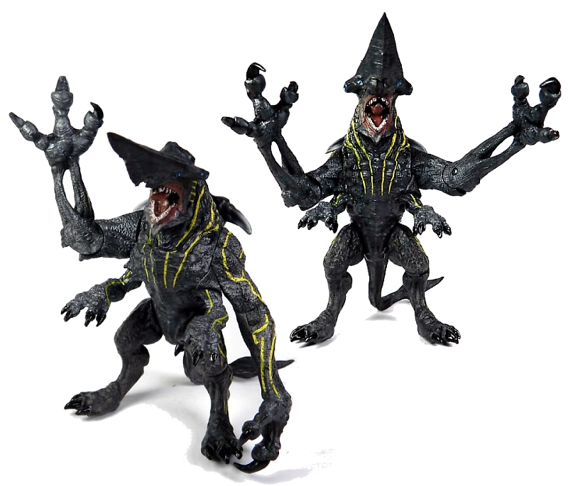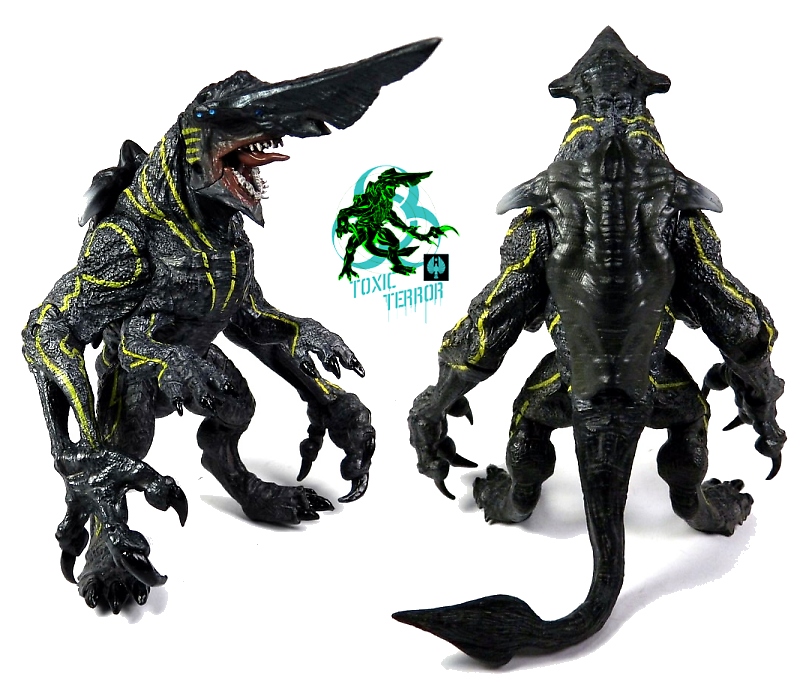 Moving on down we come to another sea creature trait: a horned shell. NECA cast this piece in a different type of plastic, giving it a hard, bone-like quality. The glossy black and grey paint also works well in making it stand out. Knifehead also has a tail (but of course!), a bendy appendage that ends in a pointy paddle, or the tip of tentacle, sans the suckers. Lastly we come to Knifehead's other calling card, the creature's four arms and two stubby legs. The legs feature swivel thighs and hinged knees for basic (and appropriate) posing. Knifehead stands very well, his tail greatly aiding in display. Knifehead's arms consist of two smaller limbs that jut out from the sides of his chest and two massive appendages that end in lethal talons. The smaller arms do not move, but look slick just sticking out. The larger arms, however, feature a broad range of movement with swivel shoulders and hinged elbows. It doesn't sound like much, but trust me, you can get some sweet attack poses with these joints. These big limbs star an incredible sculpt where the ulna and radius arm bones are "exposed" - creating this gaping hole in the arm. The talons, like Knifehead's deadly head, are also extremely sharp and pointy. It's all so appropriate: a deadly toy of a deadly monster! Bringing this funky fiend together is a matte black color scheme highlighted with swirly yellow tribal designs. From the trailers I've seen it appears that the Kaiju have this alien energy coursing through them - the yellow tribal swirls replicating that effect on the figures. It looks really cool and I can already see the potential for some "powered up" variants down the road using glow-in-the-dark/ day-glo paint. Or a light-up feature... how cool would that be?