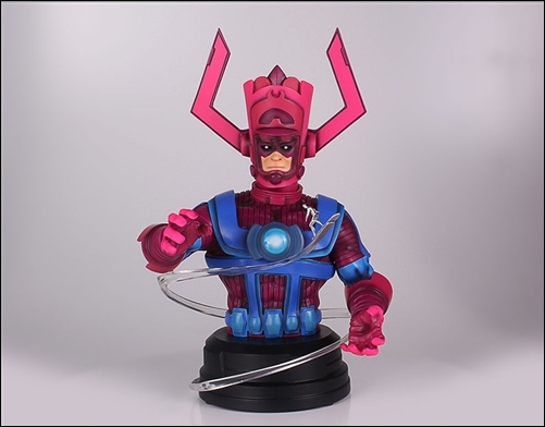 Gentle Giant presents their 2013 SDCC Exclusive Galactus Mini Bust. Digitally sculpted by the master artisans at Gentle Giant Ltd., this intimidating bust features the fearsome Ravager of Worlds in fine detail using only the highest quality polystone. As an added bonus, his most famous Herald, the Silver Surfer is rendered in high-quality pewter, orbiting his master! This limited edition mini bust is hand painted and comes individually numbered, and includes a matching certificate of authenticity.