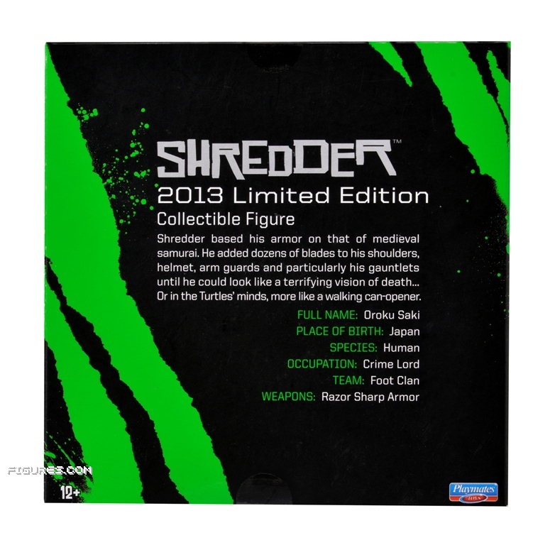 As previously reported, Playmates Toys and Nickelodeon will be debuting a special San Diego Comic-Con edition Shredder action figure, which will be on sale in Nickelodeon’s booth #4113. Standing at a height of 5.75 inches tall, the 2013 Comic Con Edition Shredder is ready for battle. Protected by his vacuum metallized razor-sharp armor and helmet, Shredder stands on his customized sewer lid base looking for revenge. Packed in his one of a kind, four color closed box, new photos pictured above and below.