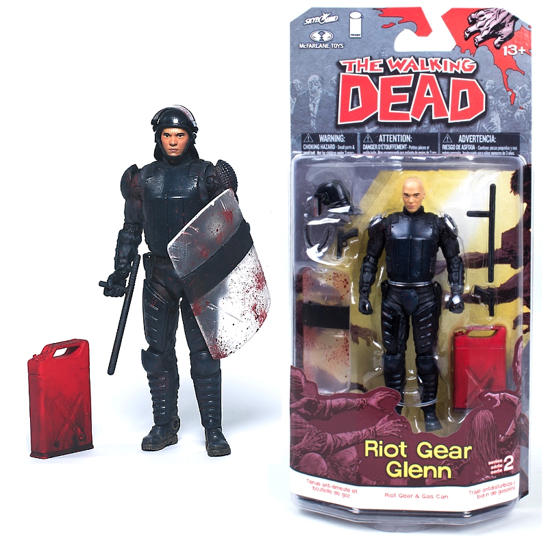 - Riot Gear Glenn: features 28 points of articulation and is equipped with two pistols, riot shield, baton, gas can, and removable helmet with flip-up visor.