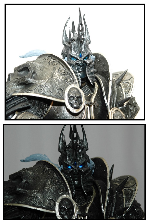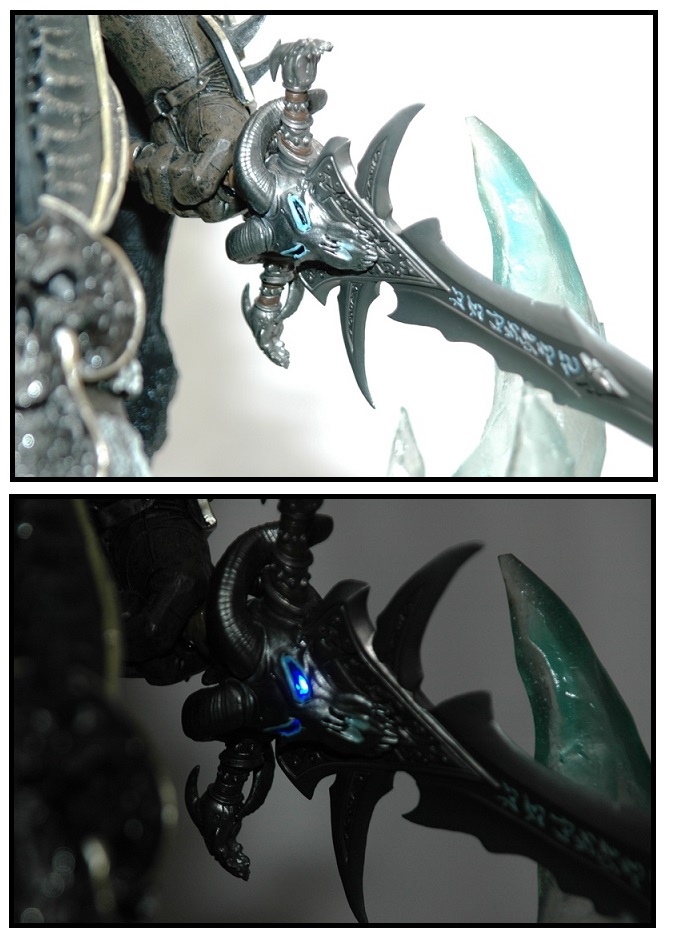 A compliment to the overall look and feel of the Arthas statue is the light-up feature, providing a bright, blue light which shines from both Arthas' eyes (above) and the eyes of the Frostmourne runeblade (below). These lights ignite when a small button on the back of the base is pushed. Powered by a pair of AA batteries, housed in the bottom of the base, these lights add an ambiance to the statue and, when shown in a dark room or setting, provide an engaging, haunting look.