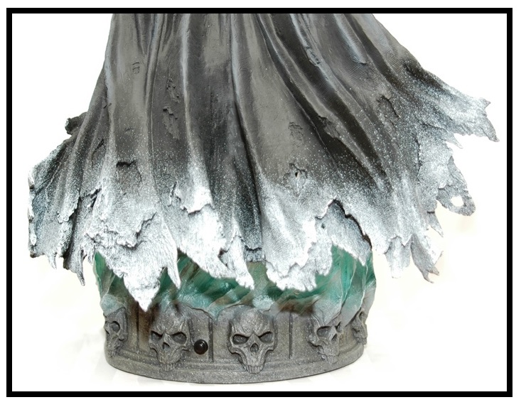 Each and every armor plate compliments the whole suit and the design of the character, years older than this statue, has never before been captured this elegantly or with this much detail. From the armored gauntlets and gloves - covered in spikes and featuring fine leather-like texture and detailing, to the leg armor and fur-covered boots - featuring leather-like straps and skulls at the knees as well as rib bone-like sculpting atop the cuisse (thigh armor), Arthas looks screen accurate and impressive beyond measure. Of note, the massive, wind-blown cape flows behind the figure on the figure's right side, sweeping from the shoulder armor and around the base to balance the statue's ice pillars, which rear from the ice bases' left side.