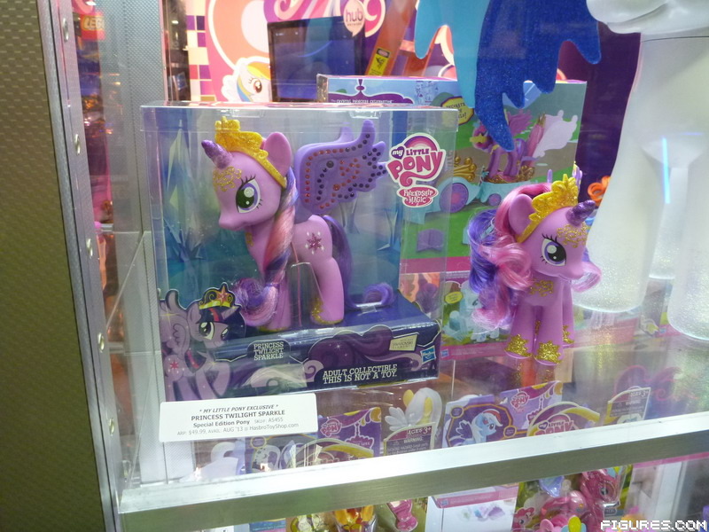 One of the biggest and most popular franchises right now, My Little Pony: Friendship Is Magic simply knows no bounds. Popular with adults as much as kids, the show, comics, and toys are consumed and enjoyed at an astounding rate, and Hasbro is right there to supply us with more of the products we love. At San Diego Comic-Con the ponies (and other denizens of Equestria) were front and center with a two display case area and photo op station with Princess Twilight Sparkle. Some of the most exciting new and upcoming products you could see there included the Toys R Us exclusive multipack featuring Queen Chrysalia (sic), a HasbroToyShop Special Edition Pony Princess Twilight Sparkle, more Crystal Pony Friends, the Cake Family Babysitting pack, the Elements of Harmony deluxe mini collectible pack, and much more!