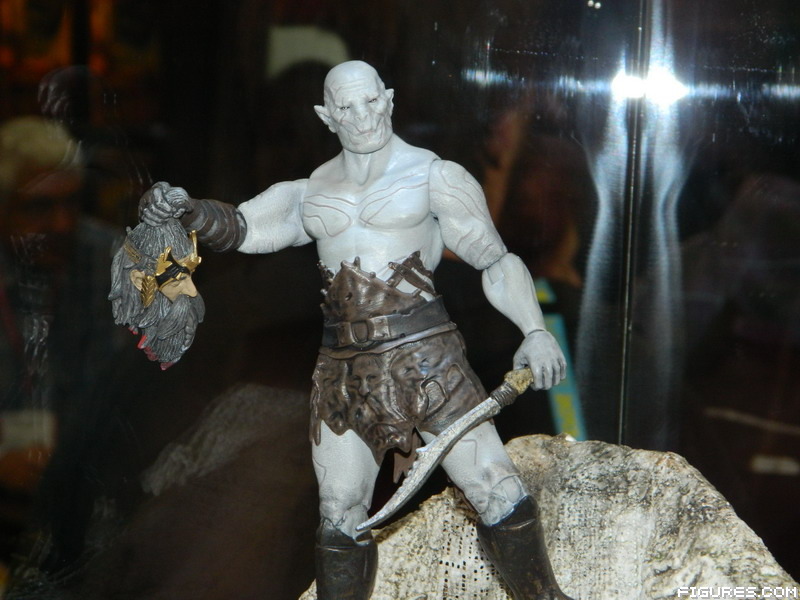 Since the release of the first Hobbit film last year Bridge Direct really made a name for itself with high quality figures from the movies in both 3 ¾ and 6 inch scales. We’ve featured their offerings for An Unexpected Journey before, and the dwarves especially were solid toys with lots of articulation, great sculpts, and the number and quality of accessories you rarely see these days. Thankfully, at Comic-Con this year Bridge Direct was back to show that they’re not stopping and we can expect more fantastic figures to bring the characters of The Desolation of Smaug to your collection! On display were a variety of figures from both movies including some new faces, notably more dwarves, elves, orcs, and more in the collector and kid friendly 3 ¾ inch lineup. There were also some upcoming 6 inch figures and of course the SDCC exclusive Orc Commander Azog, and imposing character with crucial accessories right out of the first movie!