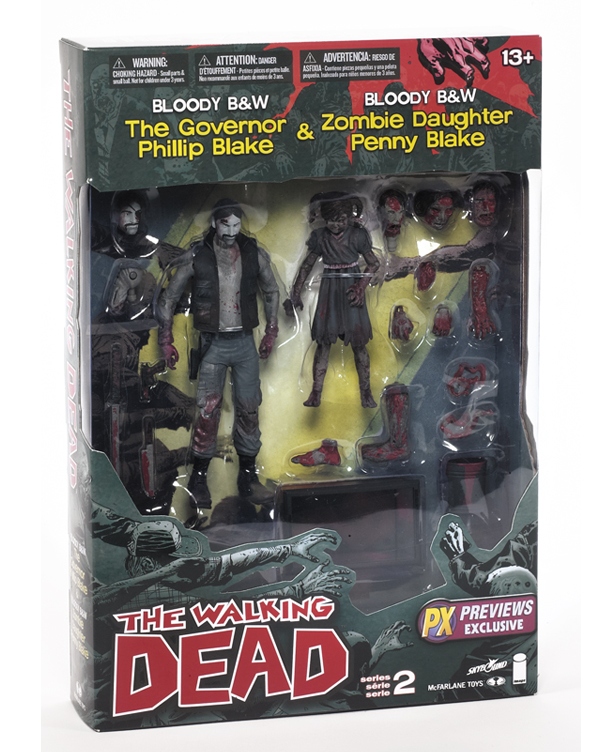 As reported to you with our San Diego Comic-Con coverage (see HERE), McFarlane Toys had reveled a new Walking Dead BLOODY BLACK & WHITE THE GOVERNOR & PENNY 2-PACK. This box set still includes all the articulation and gory accessories included with the standard figures. This boxed set is a PX Previews Exclusive from Diamond Comic Distributors and will join the release of Walking Dead Comic Series 2 figures this month (August 2013 - Item Code: JAN138175).