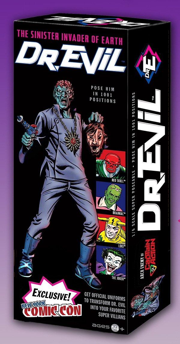 The Dr. Evil NYCC Exclusive comes complete with figure, costume, additional face mask , alien ray gun, hypno medallion and three interchangeable brains. Also included will be three collectible trading cards featuring characters from the Captain Action universe.